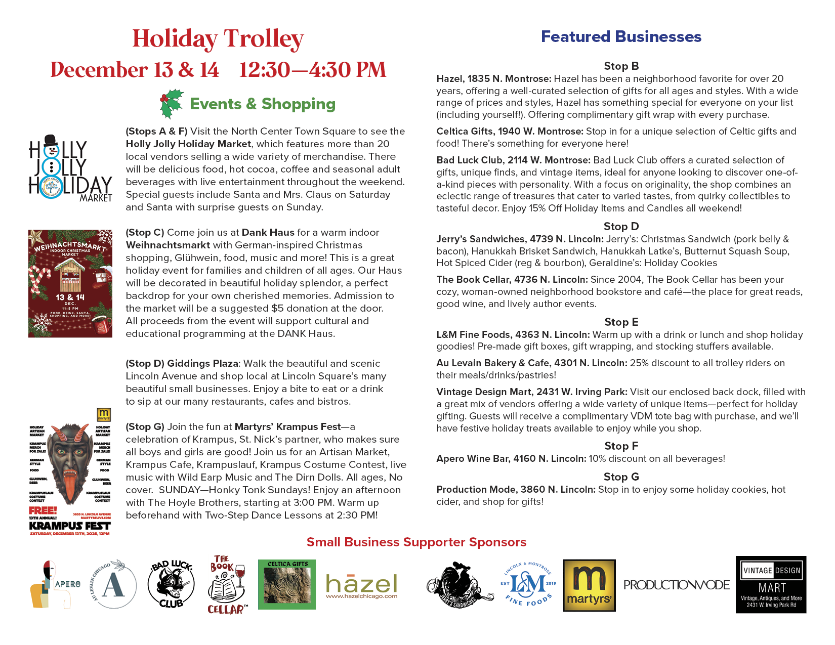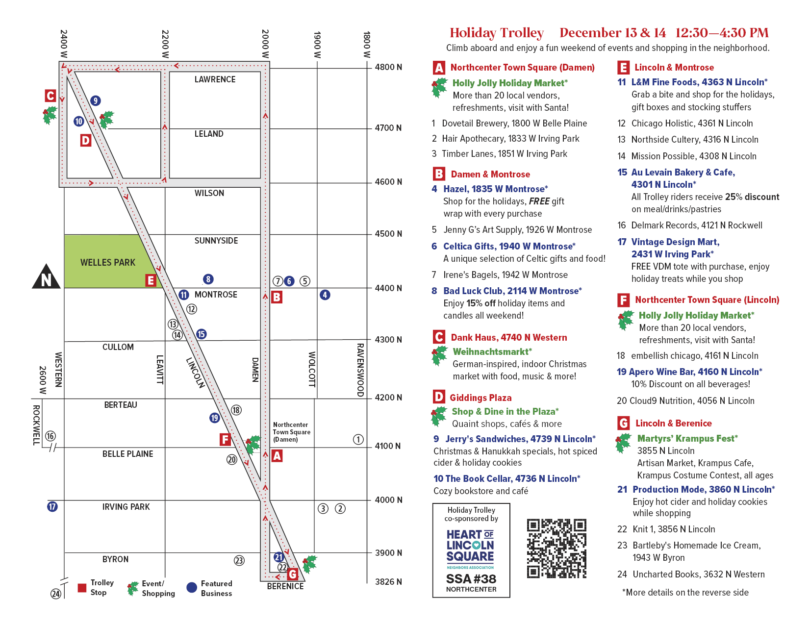 SSA 38 and the Heart of Lincoln Square, hop aboard the Holiday Trolley to visit local businesses and other festive stops throughout North Center and Lincoln Square — including Krampus Fest at Marytrs' and the DANK Haus holiday market!
