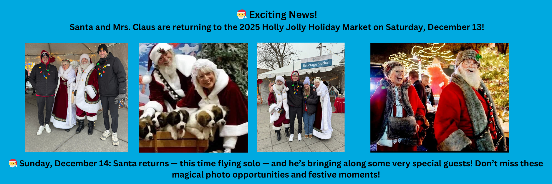 Photos with Santa will be available on Saturday, December 13th from 1:00 - 5:00 pm, Sunday, December 14th from 1:00 - 3:00. Pet photos with Santa are available the last hour of each day.