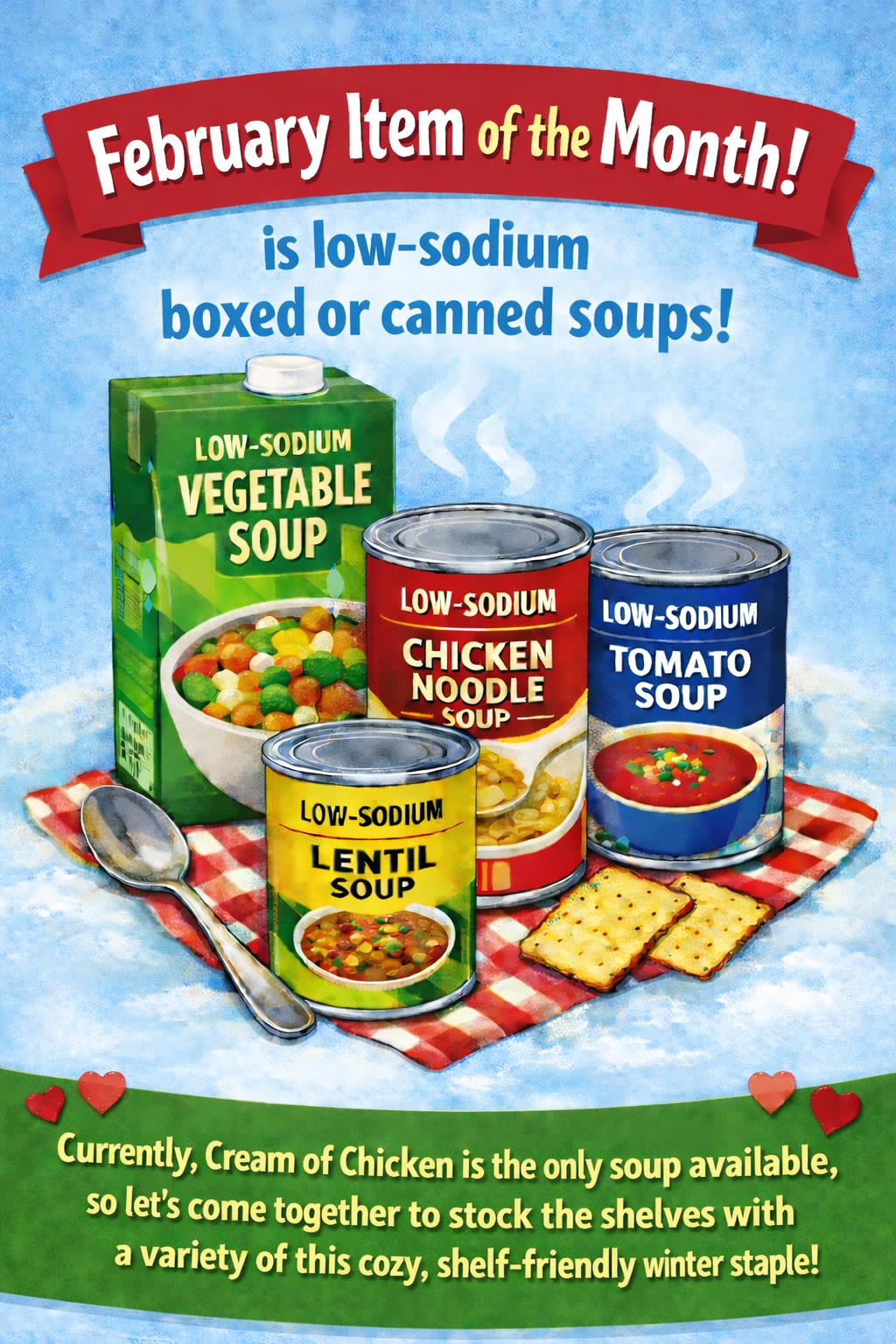 Along with the Item of the Month, the following items are also needed: sugar, flour, olive & cooking oil, spices, ground coffee, cereal (whole grain, less sugar varieties), canned fruit, jar spaghetti sauce (low sodium) and dry pasta, whole grain crackers, soup, rice, easy prep meals (i.e., Hamburger Helper (low sodium or whole grain varieties, if possible), peanut butter, jelly/jam, cleaning supplies and laundry detergent, and sandwich-size zip-lock bags.