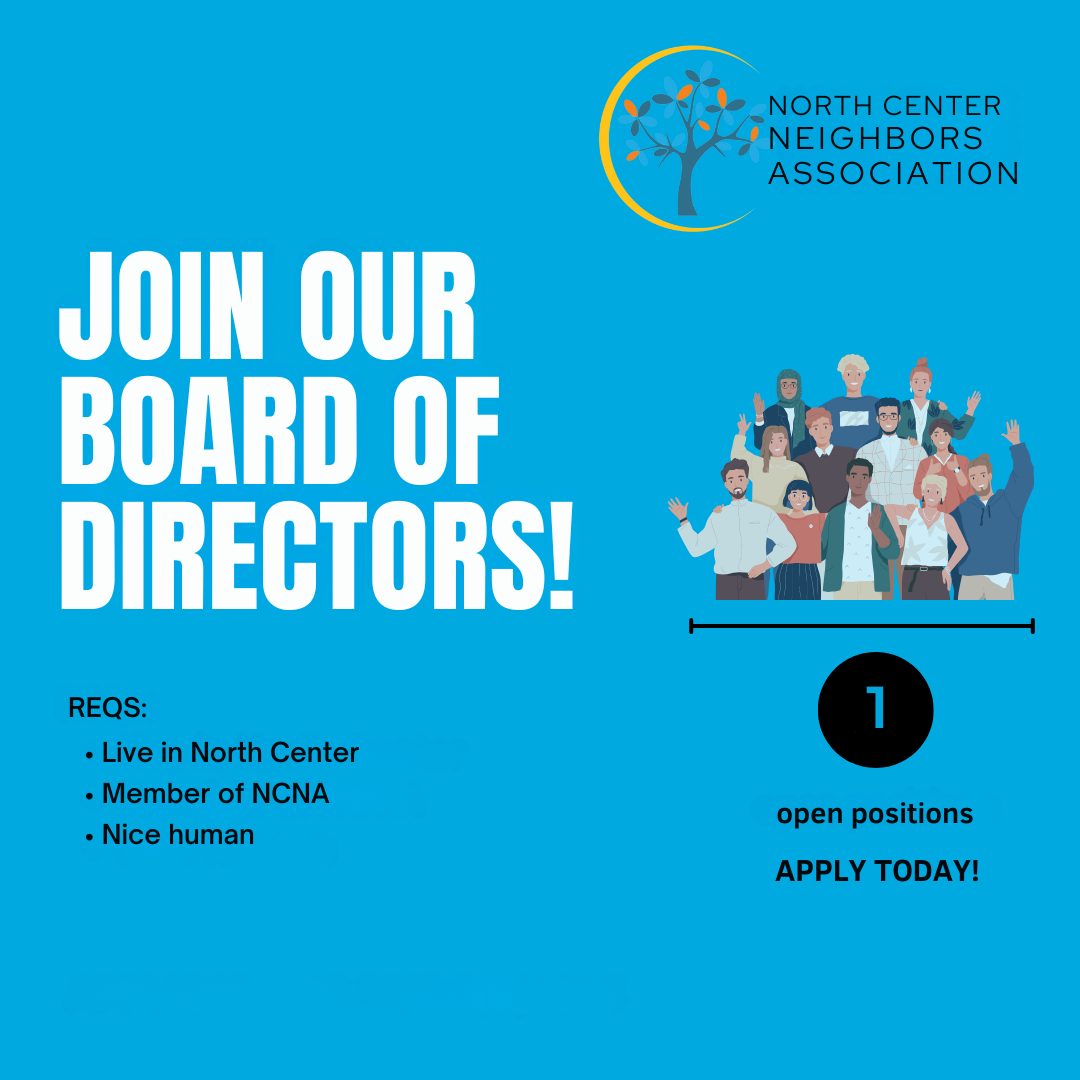 Our success depends on the involvement of North Center residents like you. If you live within the North Center boundaries and are a current NCNA member, we invite you to consider serving on our Board of Directors. Board members serve three-year terms and help guide and implement projects that support NCNA’s mission. The only requirement is your commitment to our community.